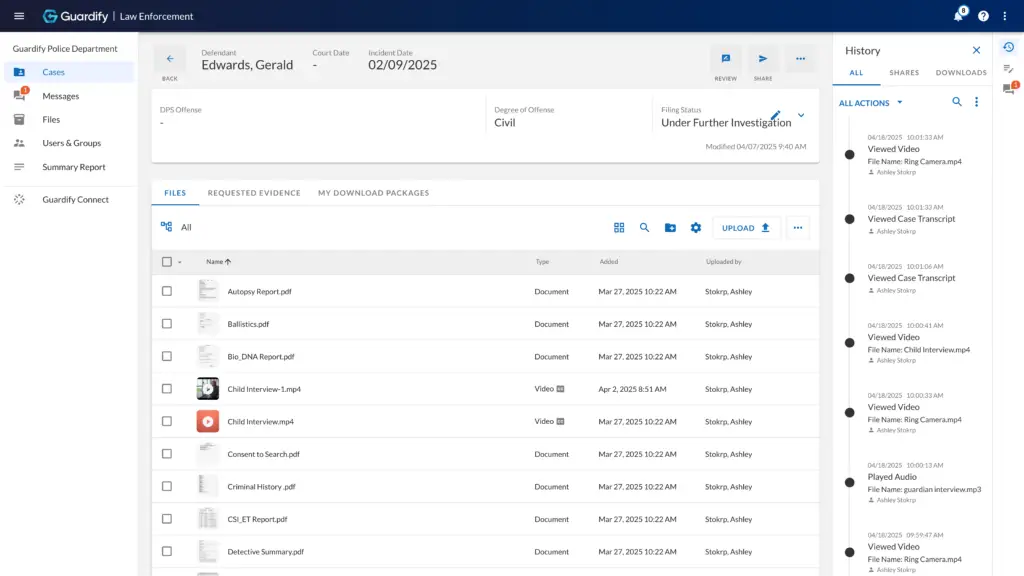 Yes. Guardify supports bulk uploads, secure evidence requests, and organized intake from any source—including body cams, mobile devices, and civilians. Our Requested Evidence feature makes it easy to collect media from the public without requiring them to create an account. And with Guardify Connect, transferring files from local devices or cloud storage is fast and friction-free.